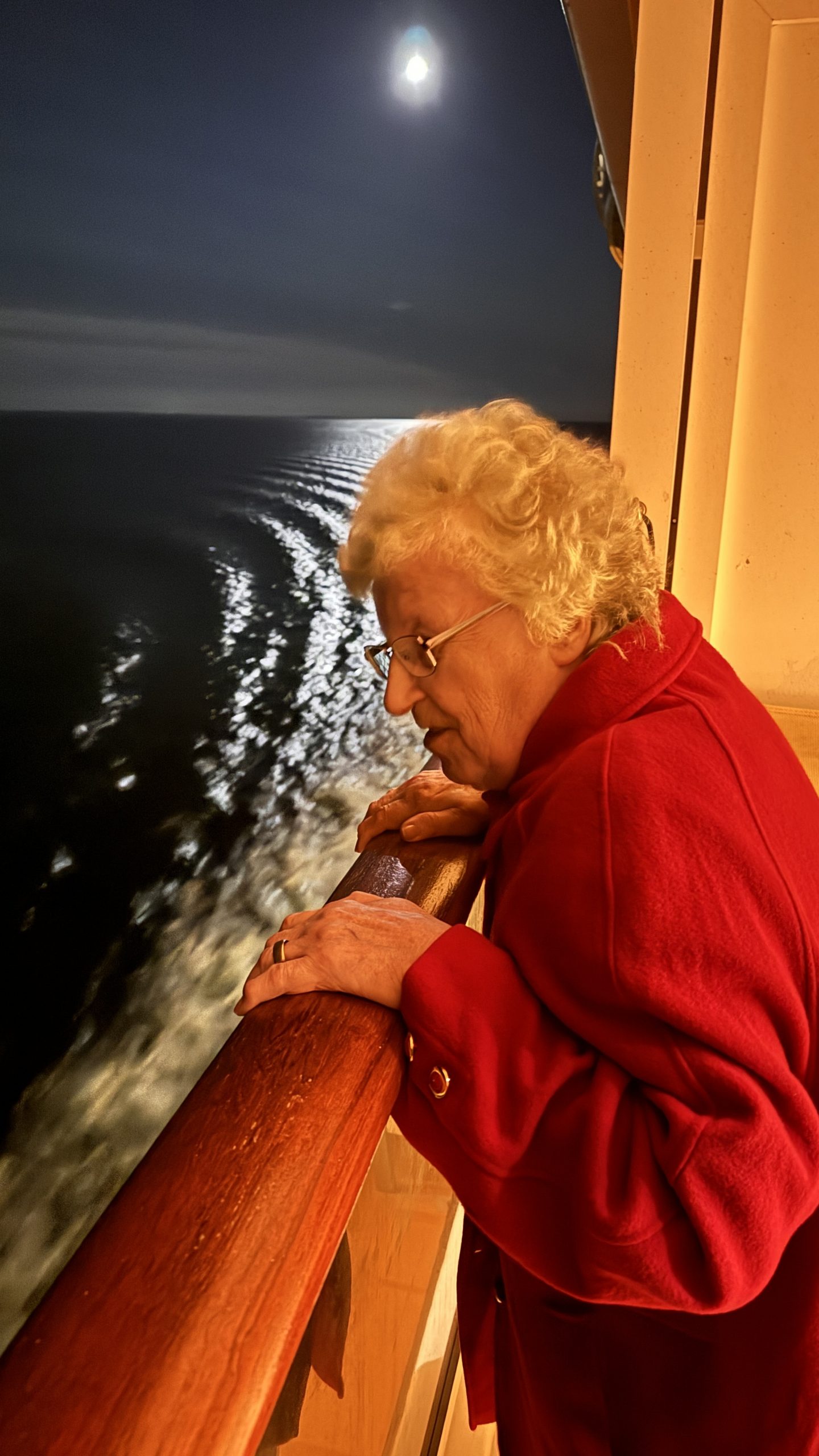 Als meine Mutter das gigantische Schiff zum ersten Mal mit eigenen Augen sah, blieb sie stehen. Fast 90 Jahre alt – und dieser Moment gehörte nur ihr. Ihre Augen wurden groß, ihr Blick wanderte vom markanten Kussmund am Bug bis hinauf zu den oberen Decks. Man konnte sehen, wie sich ein Lebenstraum in diesem Augenblick erfüllte.