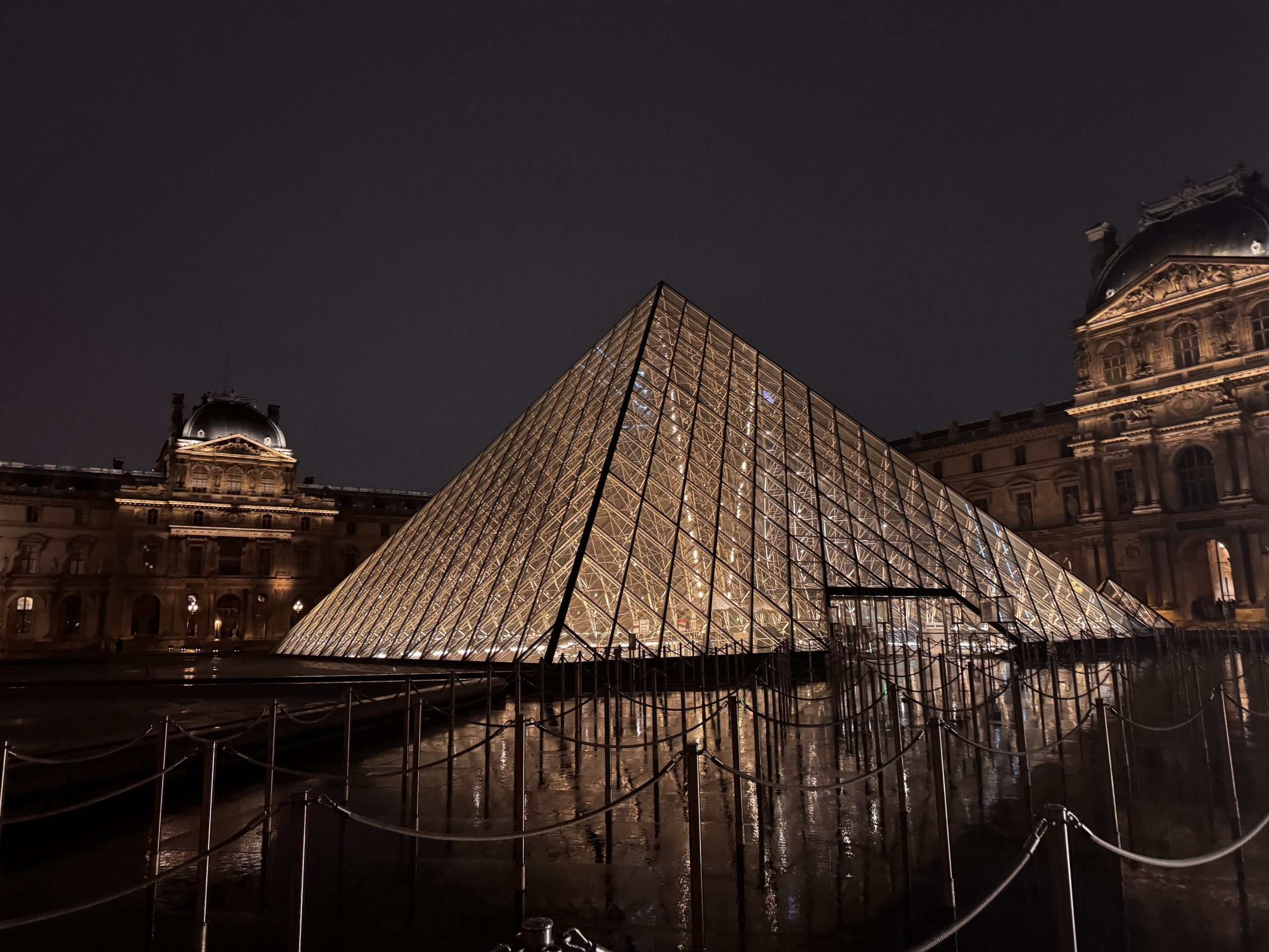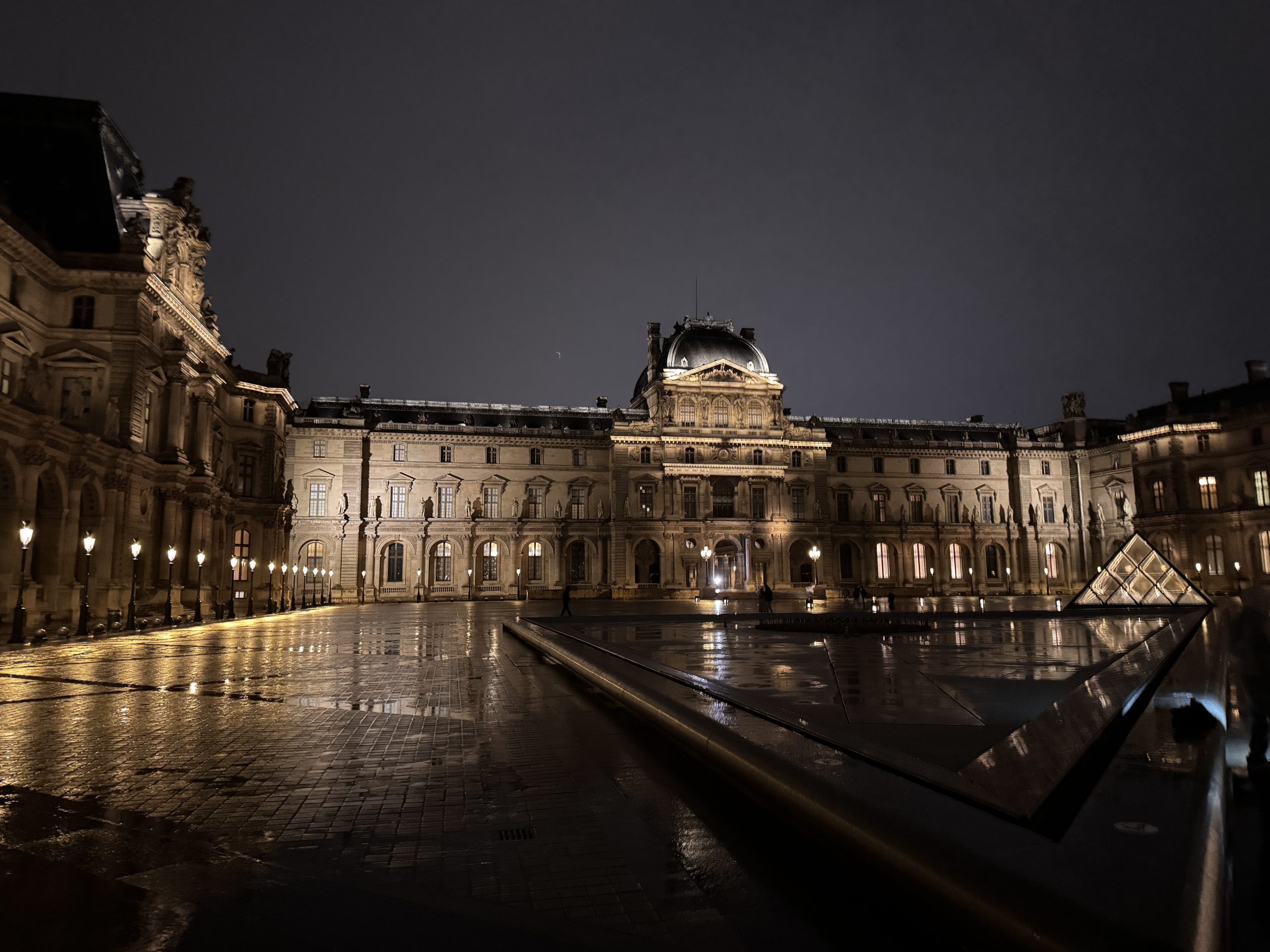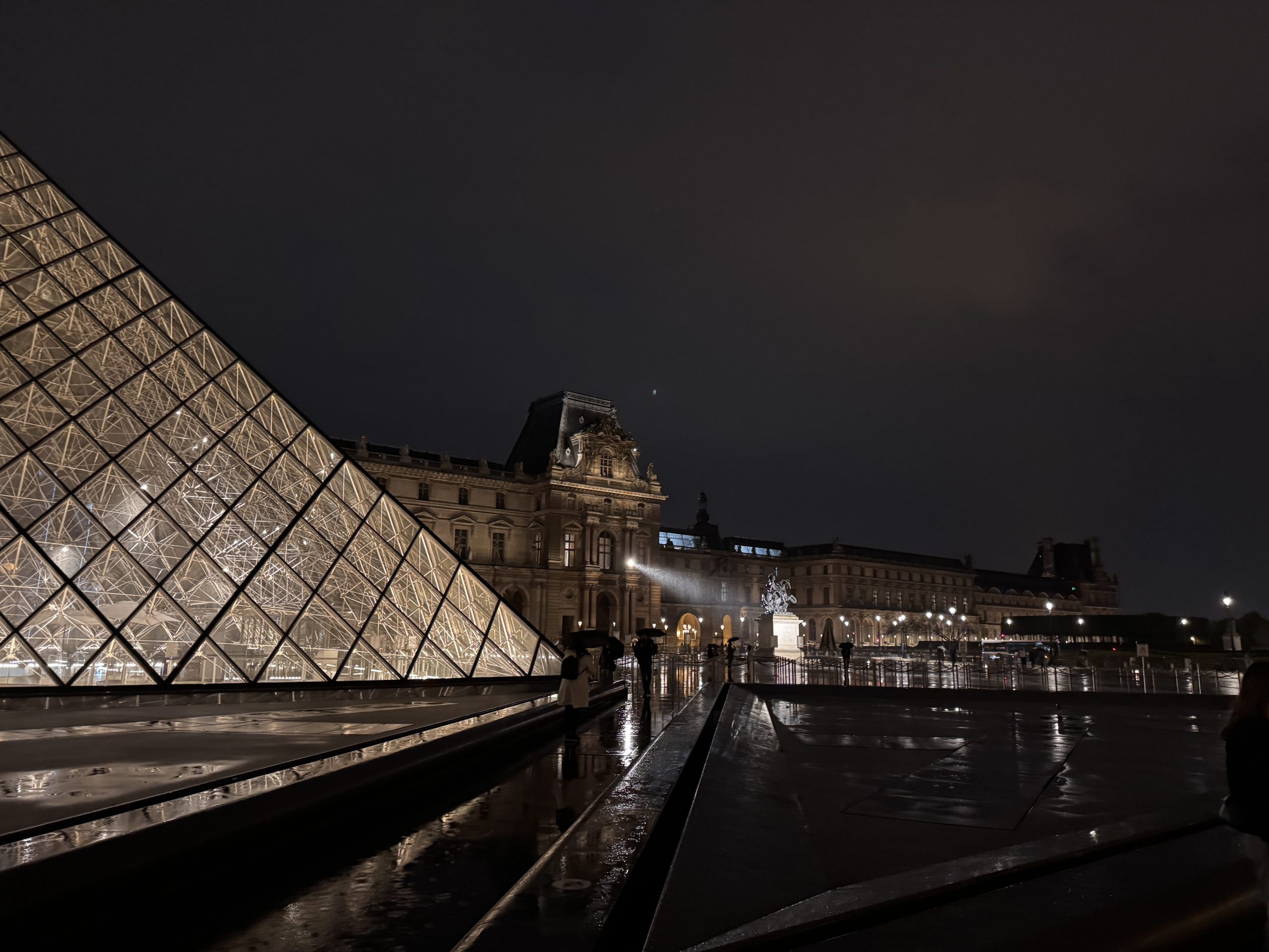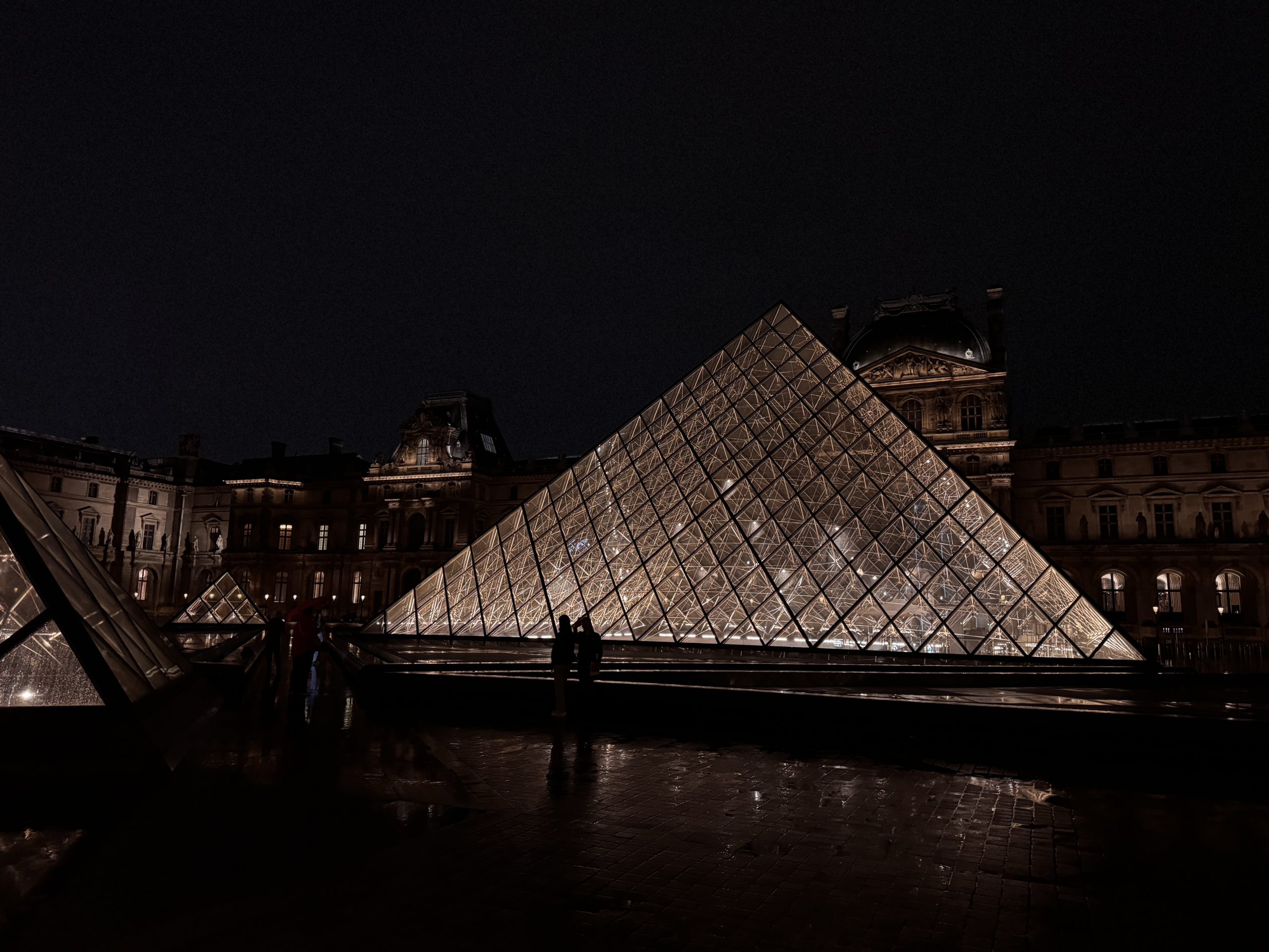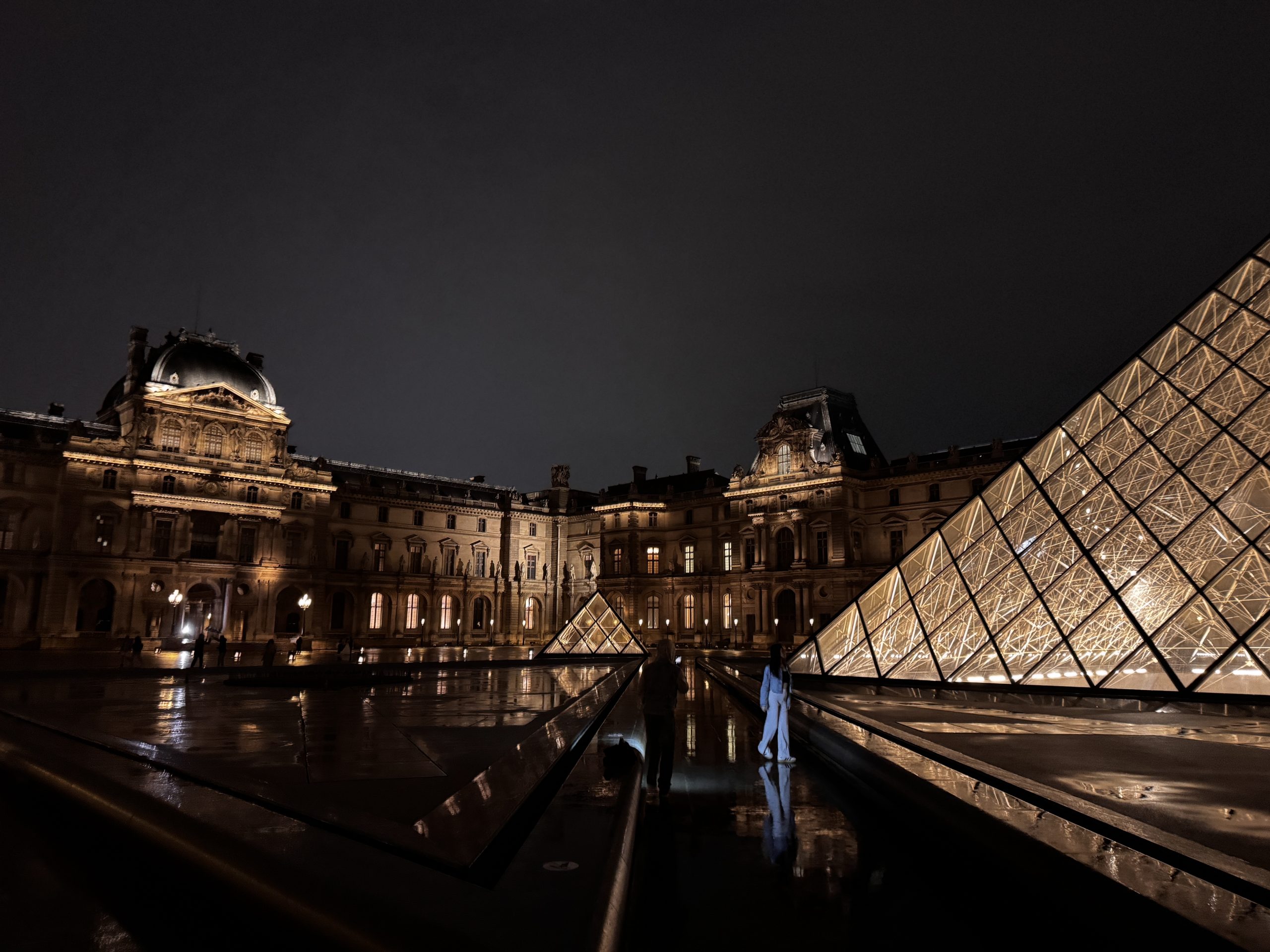 Nachts verändert sich die Atmosphäre deutlich: Die beleuchtete Pyramide reflektiert sich im Wasserbecken, der Platz wirkt ruhiger und fast feierlich. Der Louvre erscheint dann weniger geschäftig, dafür eindrucksvoll und elegant, mit einer fast zeitlosen Ausstrahlung.